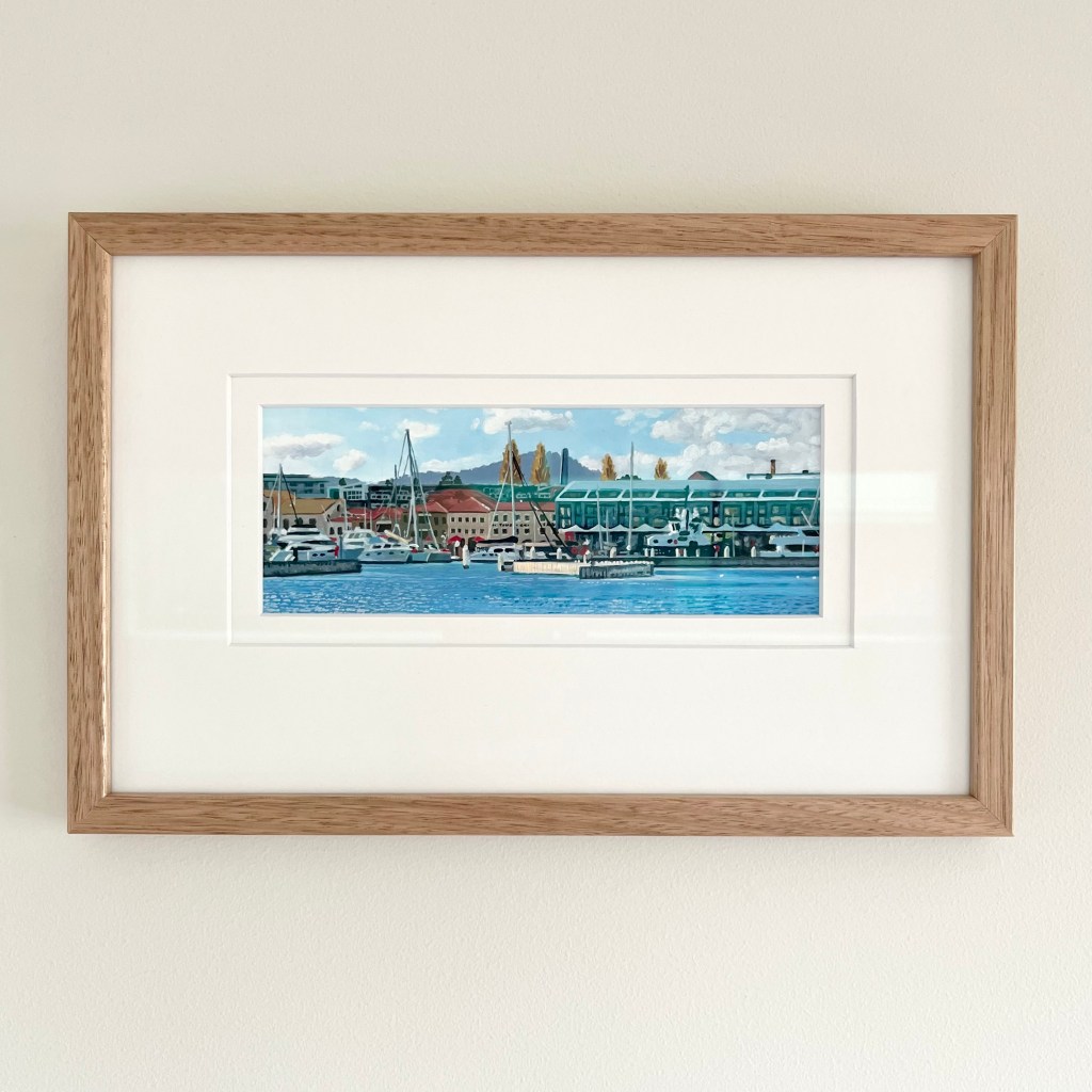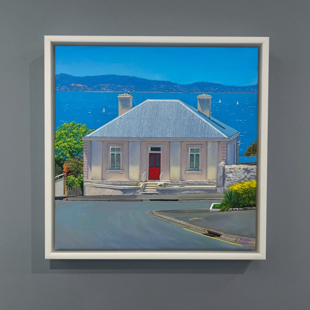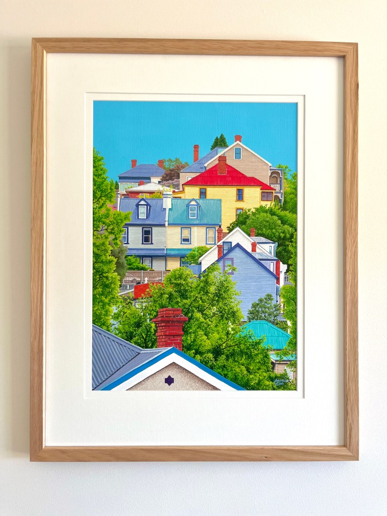 Houses of Glebe, 2025, acrylic on paper, by Jasmin Ellis (Artwork size: A3 – 297 x 420mm) Framing: Double matting, ArtGlass, and clear lacquered oak frame. (Frame size: 458 x 588 mm) $1100Houses of Glebe – Limited Edition Prints, 2025, archival pigment inkjet print on 100% Cotton rag paper, by Jasmin Ellis. These prints are sold unframed in two sizes: A4 – $145 and A3 – $195Hobart Wharf Miniature, 2025, acrylic on Paper, by Jasmin Ellis (Artwork Size: 190 x 70 mm) Framing: Double matting, ArtGlass and clear lacquered oak frame. (Frame Size: 315 x 210mm) Price: $430A Cottage Overlooking the Derwent, 2022, acrylic on canvas, by Jasmin Ellis (Canvas size 358 x 358mm) Frame: Matte finish white tray frame. Price: $990